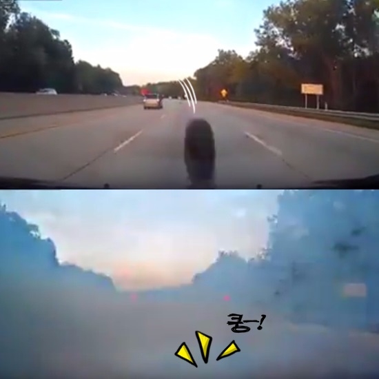 미국 인디애나주 고속도로를 달리던 차량, 난데없이 웬 타이어 하나가 날아들어 차량 보닛을 덮치는데요.