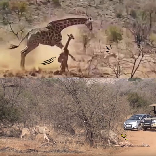 사자들이 갓 태어난 여린 새끼 기린을 공략하지만, 그리 호락호락하지 않죠.