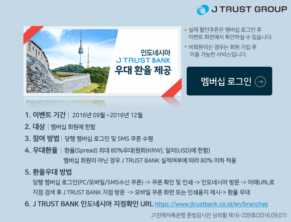 이번 이벤트를 통해 제공되는 우대 환율 쿠폰은 J트러스트 뱅크 인도네시아 지점에서 사용할 수 있으며, 달러(USD)는 물론 원화(KRW)까지 환율 우대를 받을 수 있다. J트러스트 그룹 계열사인 JT친애저축은행, JT저축은행, JT캐피탈 멤버십 고객이면 조건 없이 환율 우대를 받을 수 있으며, 오는 12월까지 진행된다.