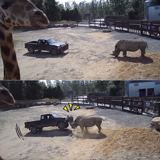 이제 때가 됐는지 점점 더 도발을 일삼는 픽업트럭에게 드디어 예민해진 코뿔소의 공격이 시작되는데...