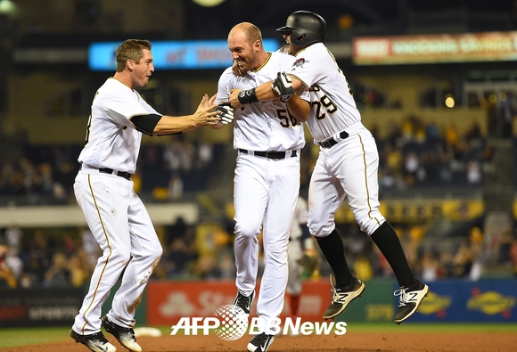 [쿠키뉴스=이소연 기자] 지난 23일(현지시간) 미국 펜실베이니아주 피츠버그 PNC파크에서 2016 메이저리그 피츠버그 파이어리츠와 워싱턴 내셔널스의 경기가 열렸다. 연장 11회말 2사 만루까지 간 접전 끝에 피츠버그의 제이콥스 스털링이 안타를 친 뒤, 동료들과 승리의 기쁨을 나누고 있다. 이날 피츠버그는 워싱턴에 6 대 5로 승리했다.