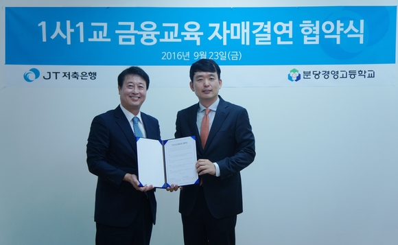 이번 협약식은 지난 23일 오전 경기도 분당에 위치한 JT저축은행에서 진행됐으며, 최성욱 JT저축은행 대표와 황윤규 분당경영고등학교장 등이 참석했다.