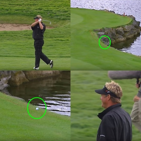 해저드 주변 바위에 통통 부딪히던 공, 헌데 핑퐁하 듯 튀던 공은 이내 그린으로 안착하는 행운을 맞습니다.