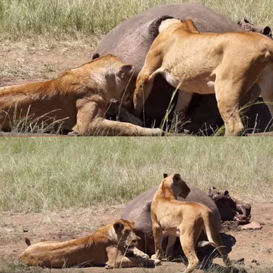 하마 사체의 항문에 머리를 처박고 저녁 만찬을 즐기는 사자, 육중한 하마의 몸통이 이리저리 움직이도록 박힌 머리를 심하게 흔들어대는 사자는 사실 영양섭취를 위해 내장을 흡입 중인데요.