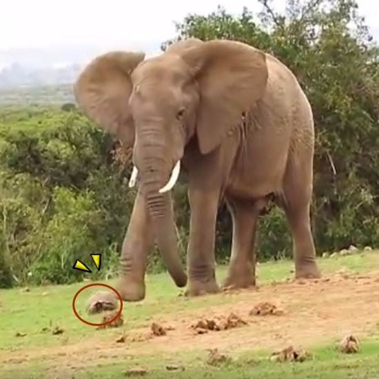 덩치 큰 코끼리 한 마리가 웬 거북이 녀석을 발로 툭툭 차는 장면인데요.