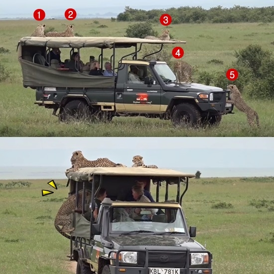 케냐 마사이 마라 국립 야생동물 보호구역을 찾은 관람객 주위로 하나 둘 모여들던 치타 녀석들, 어느새 지프차량 위까지 점령을 하면서 사람과의 친근감을 과시하는데요.