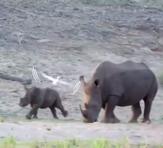 한가로이 풀을 뜯는 어미 곁에서 시종일관 뛰어다니며 주위의 다양한 새들과 함께 어울려 놀기를 원하는 아기 코뿔소.