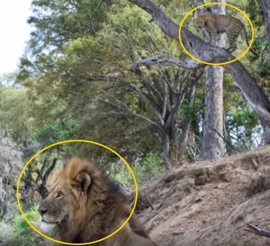 하지만 사자를 상대하기란 아무래도 역부족인 표범이죠. 바로 꽁무니를 빼고는 나무 위로 달아납니다.
