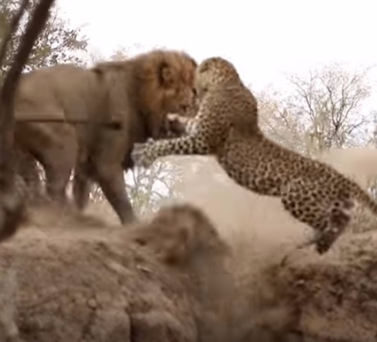 [쿠키뉴스=콘텐츠기획팀] 사자 대 표범의 강렬했지만 짧은 아쉬웠던 한판 대결 장면이 시선을 끕니다.
