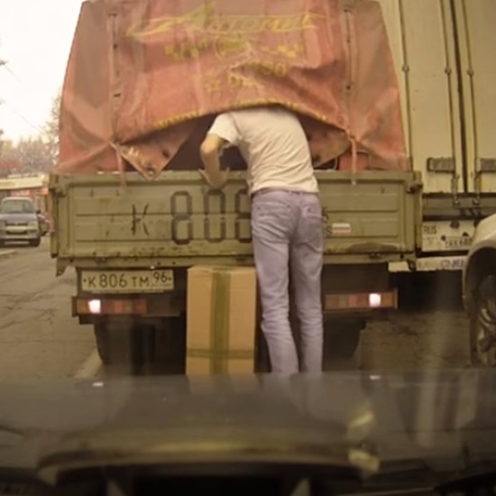 옆, 뒤 차량들의 시선은 안중에도 없이 트럭 적재함에 올라타 상자 하나를 몰래 빼내는 남성, 참 간도 크죠?