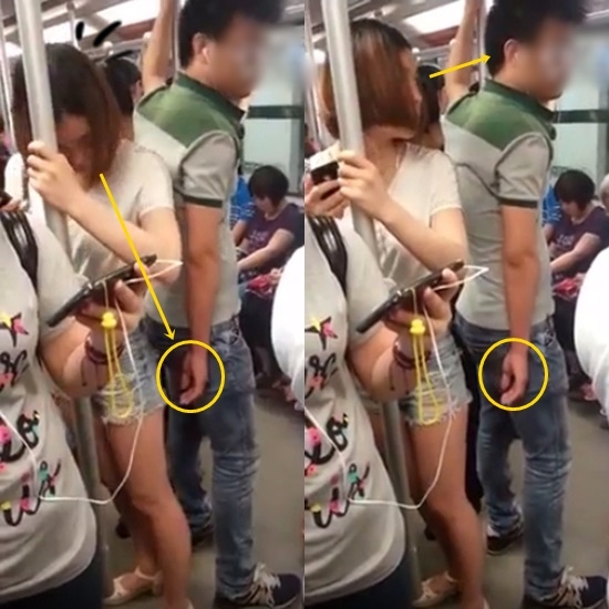 중국의 지하철 안, 짧은 치마를 입고 스마트 폰에 집중하고 있는 여성에게 검은 손이 드리워집니다.
