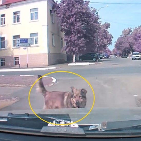 러시아 서부에 위치한 사란스크의 한 도로, 개 한 마리가 차량의 진행을 방해하며 짖어댑니다.