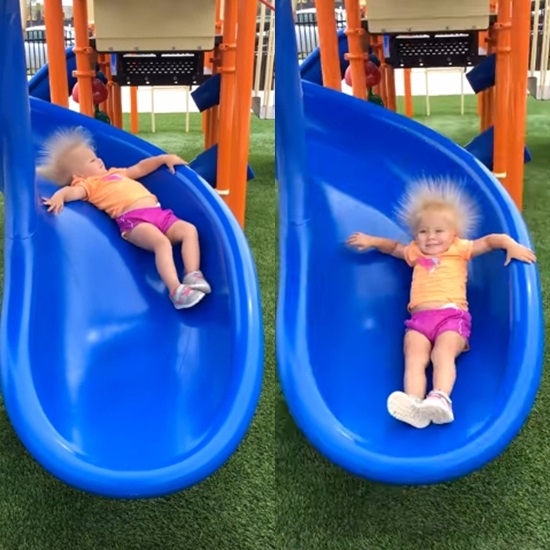 [쿠키뉴스=콘텐츠기획팀] 미끄럼을 타고 내려오는 귀여운 아이의 머리가 어째 쭈뼛쭈뼛 폭탄 맞은 모양이네요.