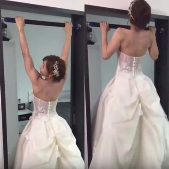 하얀 웨딩드레스를 예쁘게 차려입은 어여쁜 신부가 문틀에 설치된 봉에 매달려 턱걸이를 시도하는데...