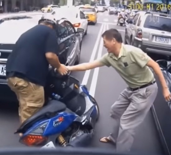 깜짝 놀란 차량 운전자, 황급히 오토바이 운전자에게 미안하다는 제스처와 함께 쓰러진 오토바이를 일으켜 세웁니다.