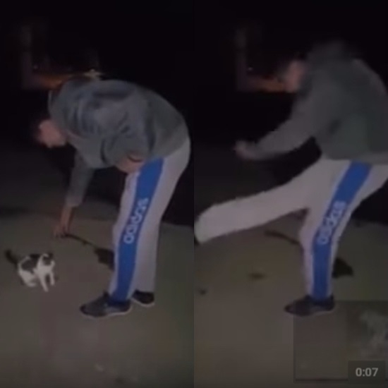야밤에 한 남성이 꼬리를 흔들며 다가온 고양이를 쓰다듬는 척하더니 가차 없이 킥을 날리는데요.