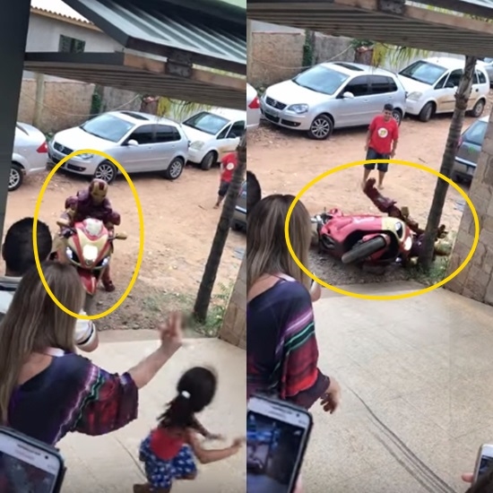 헌데 기대했던 모습과는 달리 휘청대던 아이언 맨, 무거운 모터사이클의 중심을 잡지 못하고는 꽈당 넘어지고 맙니다.