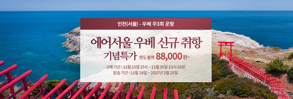 오는 30일까지 에어서울 홈페이지와 모바일을 통해 구매할 수 있으며 여행기간은 28일부터 2017년 3월 25일까지다.