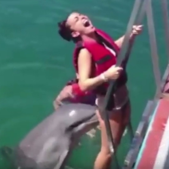 올라가는 여성을 도와준 것인지 X침을 했던 것인지 알 수는 없지만, 어쨌든 순간 당황하던 여성은 돌고래의 망측한 행동에 웃음을 참지 못하고 박장대소합니다.