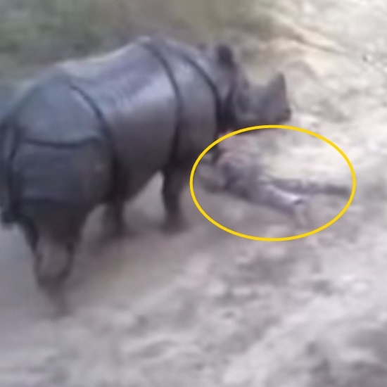 영상 촬영자가 좀 더 다가가 확인해보니 아뿔싸! 단단한 철갑 피부를 가진 큰 코뿔소가 씩씩거리며 그 앞에 쓰러져있는 남성을 툭툭 건드리고 있는 상황인데요.