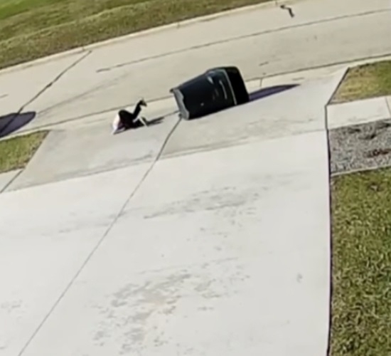 자신의 몸집보다 큰 대형 쓰레기통을 밀고 가던 소년, 세찬 강풍이 불면서 쓰레기통 뚜껑에 머리를 강타당합니다.