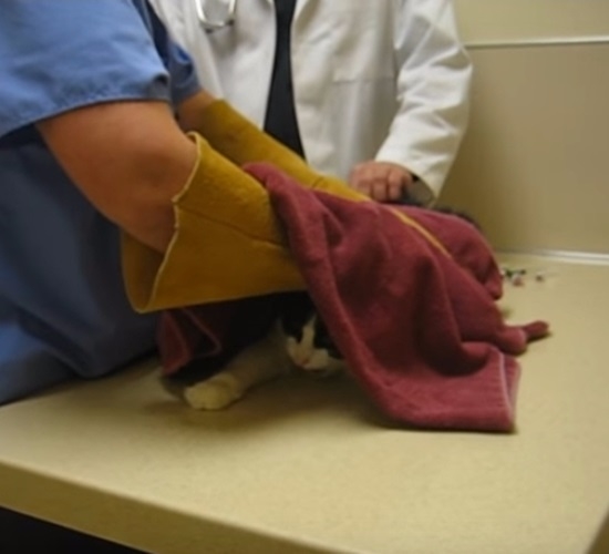 동물병원을 찾은 고양이, 수의사로부터 접종을 맞기 위해 타월이 씌워진 채 옴짝달싹 못하는 신세인데요.