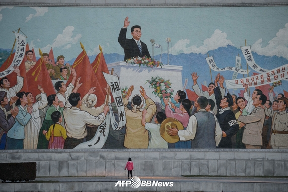 [쿠키뉴스=구현화 기자] 1일 북한 평양에 그려진 김일성의 선동적인 모자이크 상 앞에 한 아이가 서 있다. UN 안전보장이사회는 이날 핵실험을 계속하는 북한에 대해 가장 높은 수준의 제재를 도입했다.