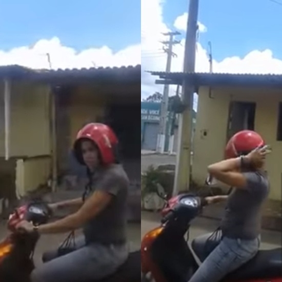 잠시 정차한 여성은 쓰고 있던 헬멧을 매만져보더니 이상한 낌새를 알아차리고는 멋쩍은 웃음을 보이며 헬멧을 고쳐 씁니다.