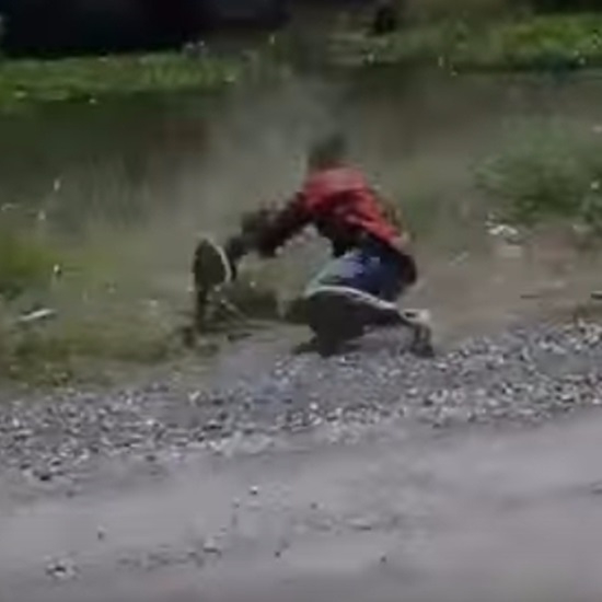 흙먼지가 날리도록 나뒹굴며 서로를 향해 주먹질을 해대는 원숭이와 남성을 보며 촬영자는 코미디 같은 장면에 웃음이 멈추질 않는데요.