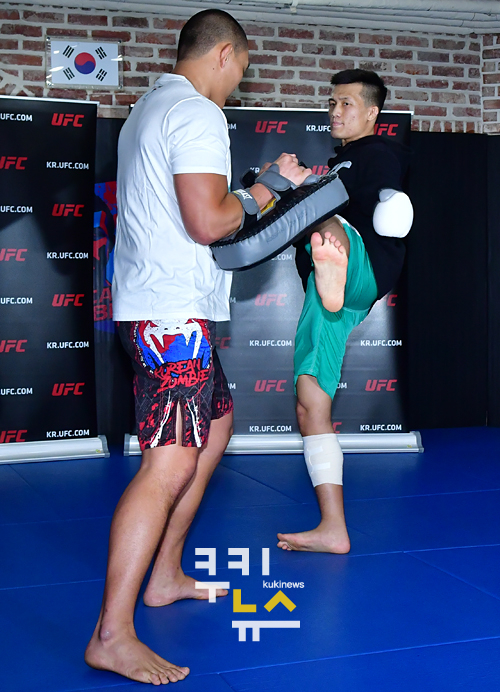 [쿠키뉴스=박태현 기자] 이종격투기 정찬성 선수가 4일 오후 서울 역삼로 코리안좀비 종합격투기 체육관에서 공개훈련을 하고 있다.