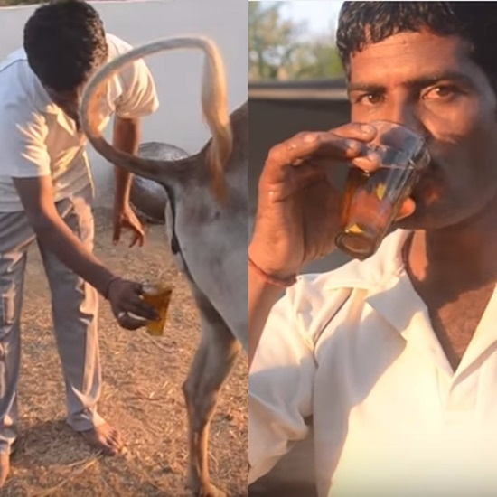 [쿠키뉴스=콘텐츠기획팀] 한 남성이 컵에 소의 오줌을 받고 있네요.