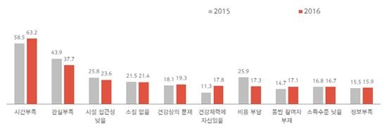 한편 ‘관심 부족’(37.7%), ‘체육 시설 접근성 낮음’(23.6%), ‘비용 부담’(17.3%) 등의 원인은 감소하는 추세인 것으로 나타났다.