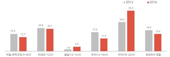 체육 참여 시간을 기준으로 살펴보면 퇴근 후인 ‘저녁 6~10시’의 참여율이 36.3%로 가장 높았다. 점심시간인 ‘12시~오후 2시’의 참여율은 4.0%로 가장 낮았지만 전년과 대비해 2배 이상 가까이 증가한 것으로 나타났다. 또한 퇴근 후 저녁시간과 점심시간 참여율은 증가한 반면 그 외 시간대의 참여율은 모두 감소한 것으로 나타났다.
