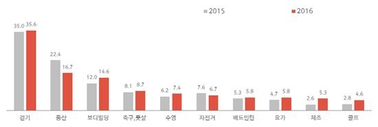 ‘한 달 1번 이상 규칙적으로 생활체육에 참여하는 응답자(70.5%)’가 참여하는 체육 종목(1~3순위)은 2015년과 동일하게 ‘걷기’(35.6%), ‘등산’(16.7%), ‘보디빌딩’(14.6%)인 것으로 나타났다.