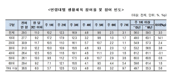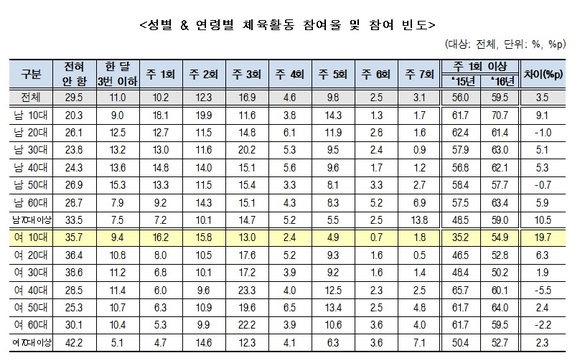 문화체육관광부(장관 조윤선)와 한국문화관광연구원(김정만 원장)이 전국 17개 시도 만 10세 이상 국민 9012명을 대상으로 실시한 2016년 ‘국민생활체육 참여 실태조사’ 결과에 따르면 국민의 59.5%가 생활체육에 참여하고 있는데, 이는 전년 대비 3.5%p 증가한 수치다. 특히 10대 여학생의 참여율이 전년도 35.2%에서 54.9%로 19.7%p 대폭 상승하며 가장 높은 증가세를 보였다. 이 외에도 10대 남학생, 70대 이상 남녀 등의 참여율도 두드러졌다.