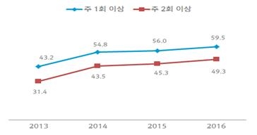 이번 발표에 따르면 주 1회 이상 규칙적으로 생활체육에 참여한 비율은 2014년에 과반(54.8%)을 기록한 이후 지속적으로 증가해 2016년 참여율은 59.5%을 기록했다. 이는 2015년 56.0%와 대비해 3.5%포인트(p) 증가한 수치다.