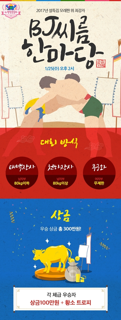 지난 추석에 이어 이번 설에도 BJ들이 씨름을 통해 승부를 가리는 이벤트 특집으로 마련됐다. 체급별 우승자에게는 상금 100만원과 황소 트로피가 수여된다.