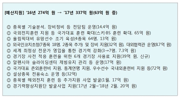 문체부는 국가대표 훈련비 등 평창동계올림픽 특별 예산으로 ’16년 274억 원을 지원한 데 이어 ’17년에는 총 337억 원을 지원할 계획이다. ▲종목별 전담팀(장비·기술·물리치료 등 14억 4천만 원) ▲해외전지훈련 확대(32억 3천만 원) ▲외국인 코치 영입(7종목 18명) 및 동계 장비 지원(32억 원) 등이다.