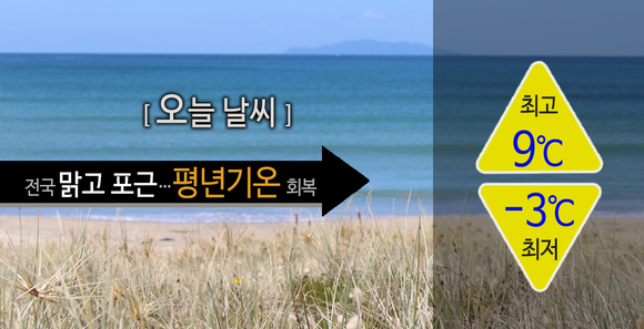 아침 최저기온은 서울 -3도, 대전 -4도, 광주 -2도, 대구 -2도, 부산 3도, 제주 2도 등으로 어제보다 높겠다.