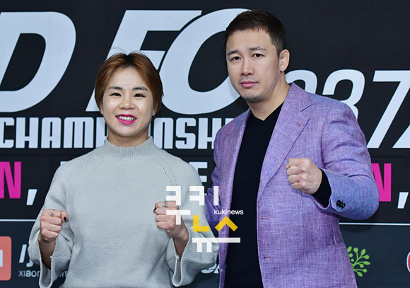 [쿠키뉴스=박태현 기자] 정문홍 대표와 함서희 격투기 선수가 2일 오후 서울 압구정로 ROAD FC 오피셜 압구정짐에서 열린 'ROAD FC 037 XX' 미디어데이에 참석해 포즈를 취하고 있다.