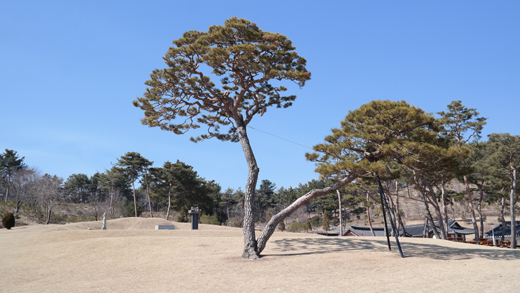 추사기념관 주변의 이런 저런 조형물들을 살피고 추사의 묘로 향합니다. 추사묘는 단정합니다. 저 아래에 얼핏 엎드려 있는 동물형상의 바위와 잘생긴 소나무를 바라보고 있습니다. 한 뿌리에서 자란 두 그루의 소나무는 마치 부부가 눈을 맞추듯 마주보고 있습니다. ‘세상이 다 원교의 필명에 놀라... 여러 학설을 금과옥조처럼 떠받드니 한 번 그 미혹에 빠지면 타파할 수 없어 참람하고 망령된 것을 헤아리지 않는다’며 조선 고유의 글씨를 추구하던 원교 이광사에 대해 추상같은 평가를 내렸던 엄격함과 단호함은 이 묘역에선 보이지 않습니다.