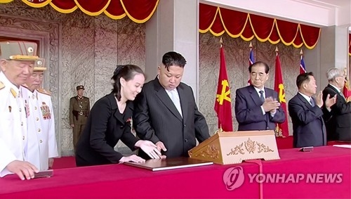 이날 검은색 투피스 차림을 한 김여정은 헌법상 국가수반인 김영남 최고인민회의 상임위원장과 주석단 출입문 양쪽에 서서 김정은을 영접했다. 이후 열병식이 시작되자 행사 안내용 책자로 보이는 화첩을 직접 들고와 김정은 앞에 펼쳤다.