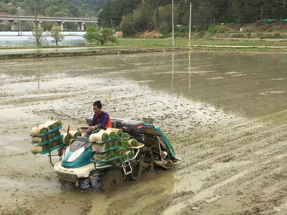 윤 씨는 지난달 말 조생종인 운광벼 볍씨를 파종해 27일간 육묘기간을 거쳐 이날 기계로 모를 심었다.