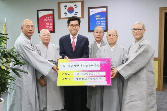 사천시불교사암연합금강회(회장 철오 스님)는 지난 20일 사천시청 열린시장실을 찾아 (재)사천시인재육성장학재단 송도근 이사장에게 500만원의 장학금을 전달했다.