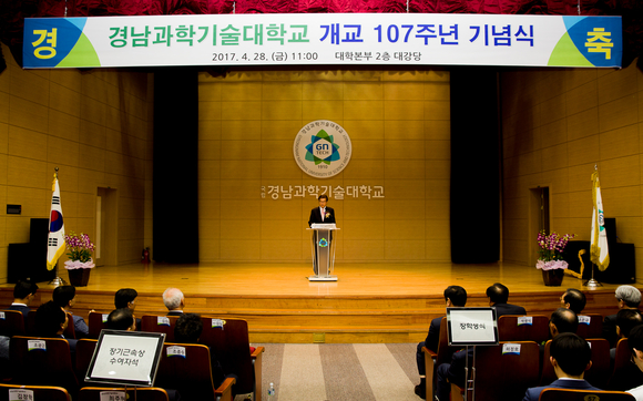 [쿠키뉴스 진주=이영호 기자] 개교 107주년을 맞은 국립 경남과학기술대학교가 28일 대학 내 본관 2층 대강당에서 개교 107주년 기념식을 개최했다.