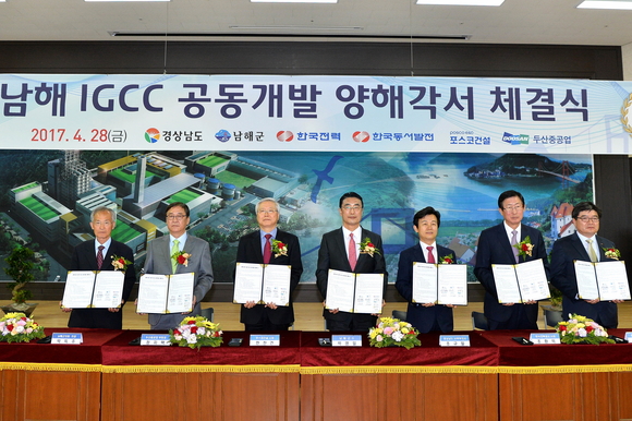 군은 28일 남해군민체육센터에서 한국전력(가스화기기 라이선스 공급), 동서발전(SPC 운영 및 발전소 운전‧유지관리), 포스코건설(발전소 건설 총괄), 두산중공업(가스화 설비 공급)과 남해 석탄가스화복합발전소(IGCC) 공동개발 양해각서 체결식을 가졌다.