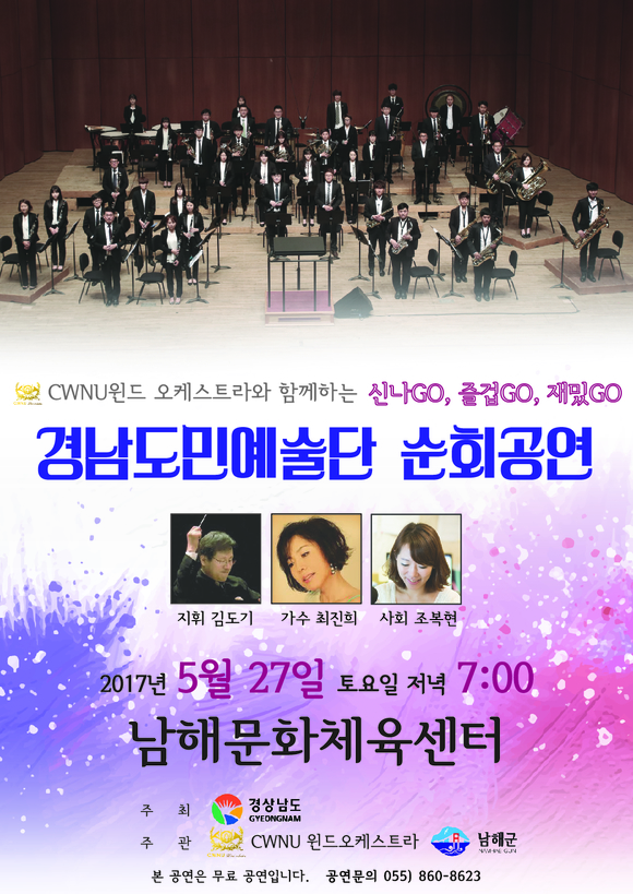 경남도민예술단은 CWNU윈드 오케스트라 관현악단 공연을 비롯해 오케스트라와 소프라노, 테너, 가수 최진희 등을 초청한 다양한 프로그램을 선보인다.