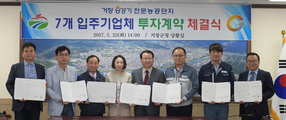 거창군은 23일 군청에서 승강기전문농공단지 입주기업체 7개사와 총 부지면적 51,532㎡에 투자금액 180여억 원, 1일 상시고용 인원 168명 규모의 집단 투자계약을 체결했다.