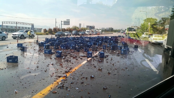 [쿠키뉴스 사천=이영호 기자] 25일 오전 10시 20분경 남해고속도로 사천나들목 인근 국도에 맥주병 2천여 개가 쏟아져 깨지는 사고가 났다.