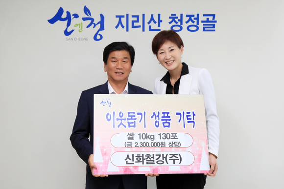 [쿠키뉴스 산청=이영호 기자] 창원시 의창구에 위치한 신화철강㈜(대표이사 정현숙)이 창립 26주년을 맞아 산청군을 방문해 산청 메뚜기쌀 130포를 기탁했다.